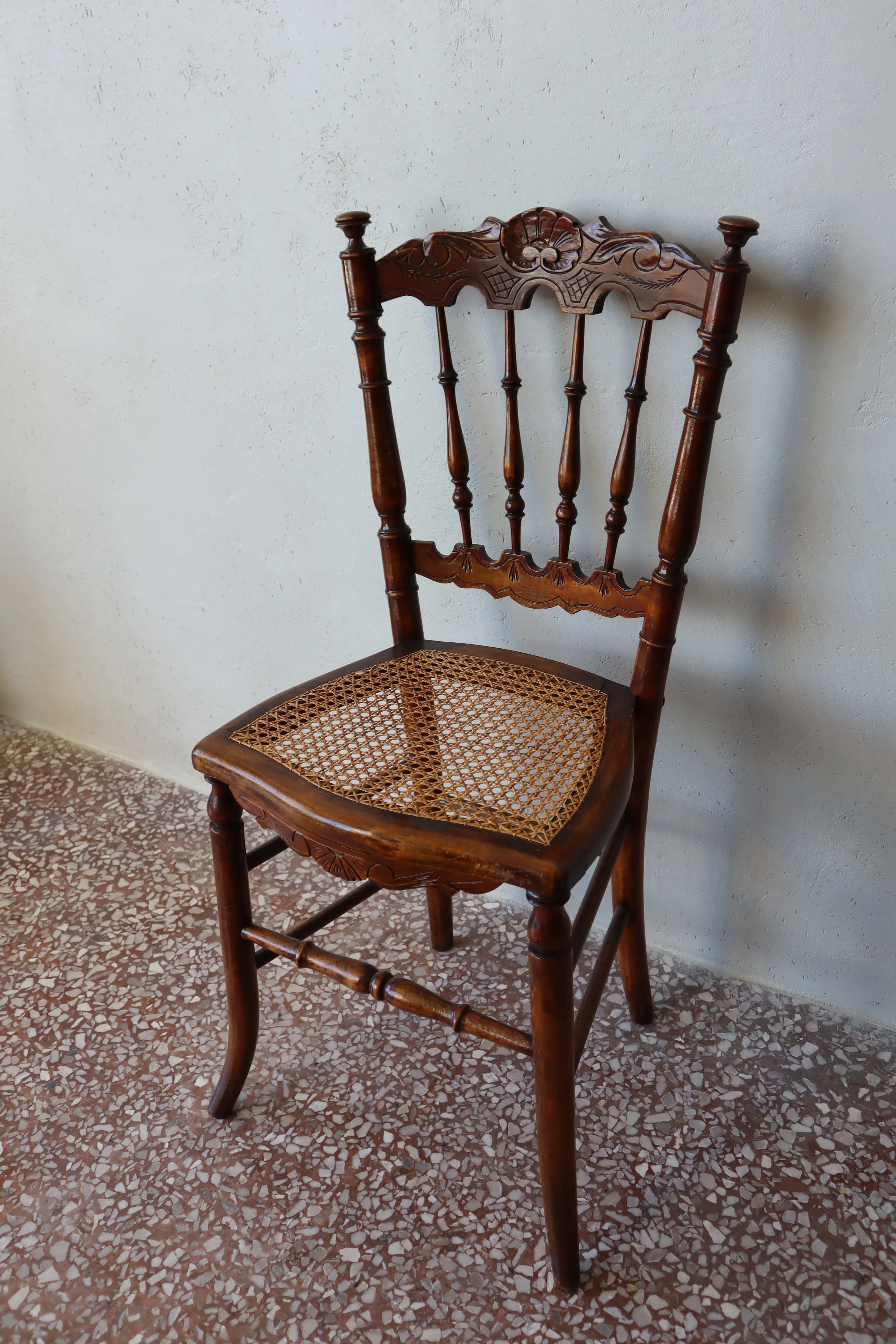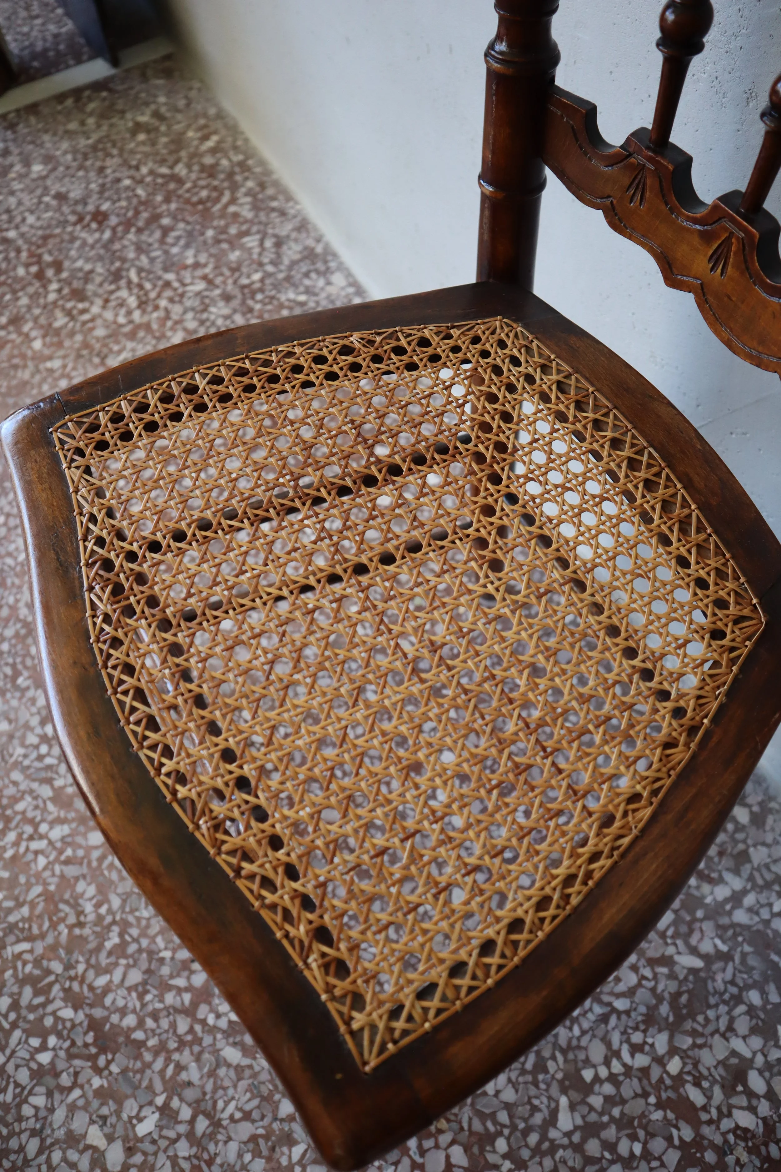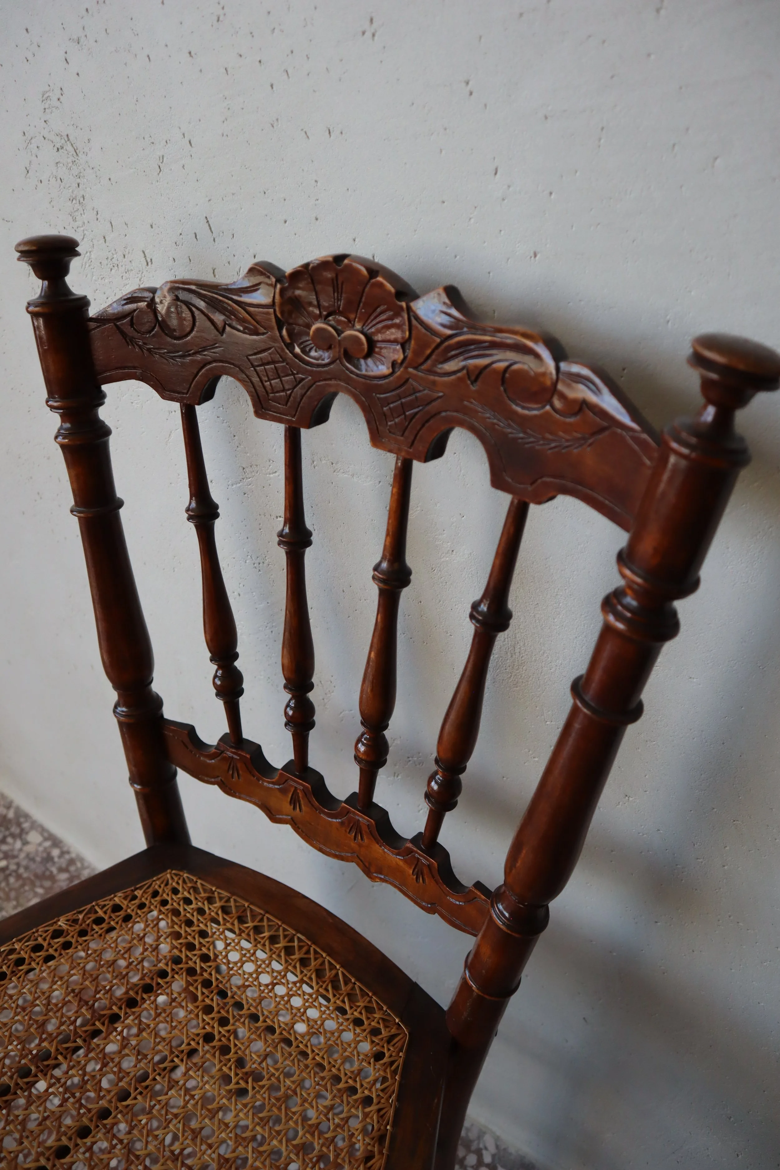 This decorative side chair features a detailed hand-carved backrest and traditional woven cane seat. A great addition to entryways, vanity setups, or as a standalone piece in layered seating vignettes.